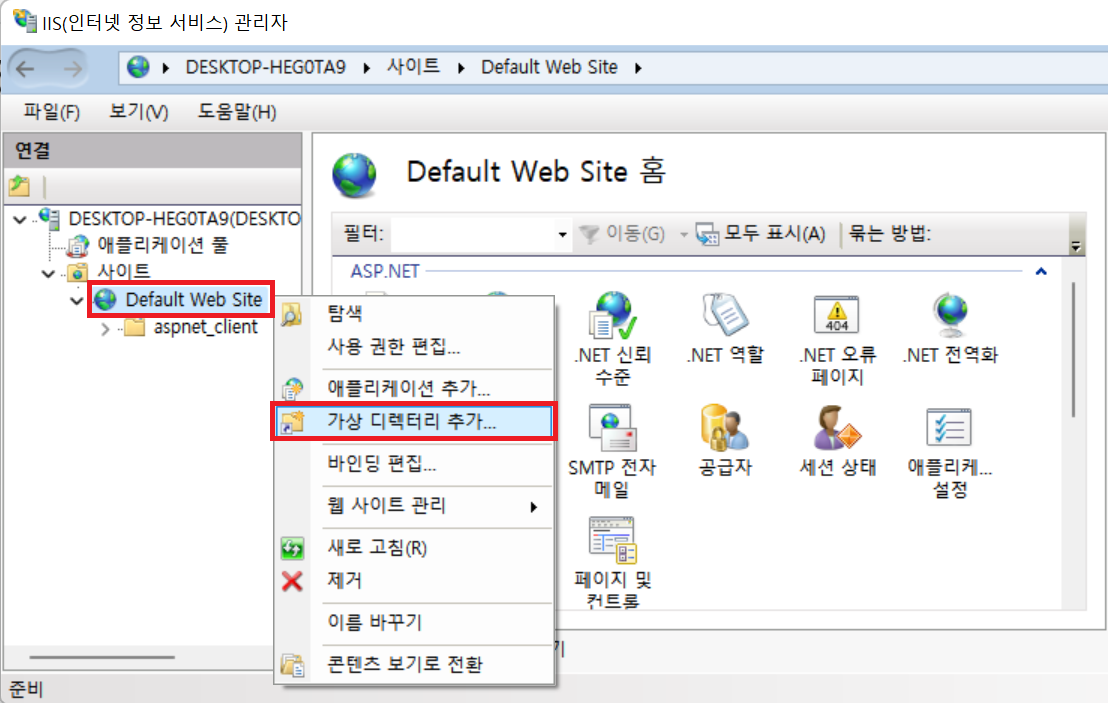 2. iis를 열어주고, Default Web Site 우클릭, 가상 디렉터리 추가를 클릭한다.