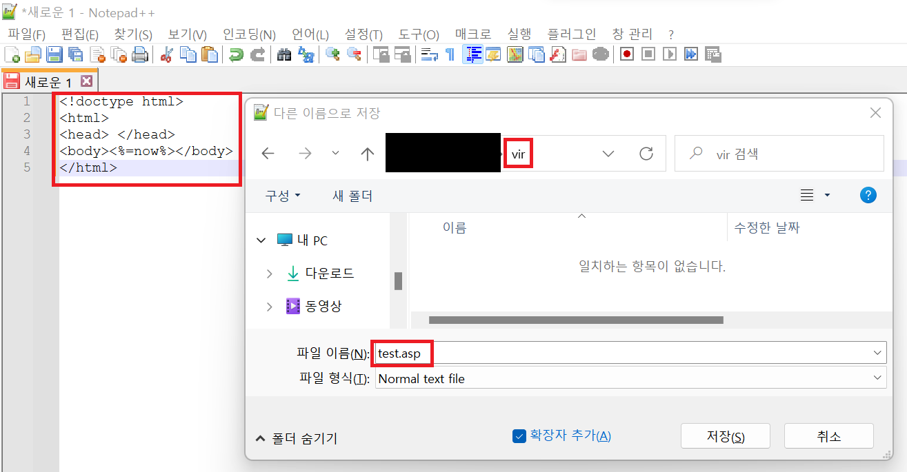 4. 다음 코드를 작성하여 과정 1에서 만든 폴더 안에 저장해준다. (확장자는 .asp로)