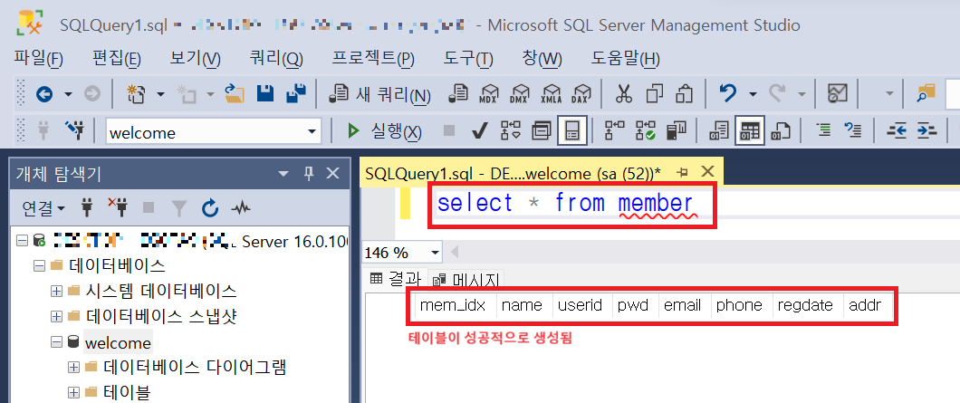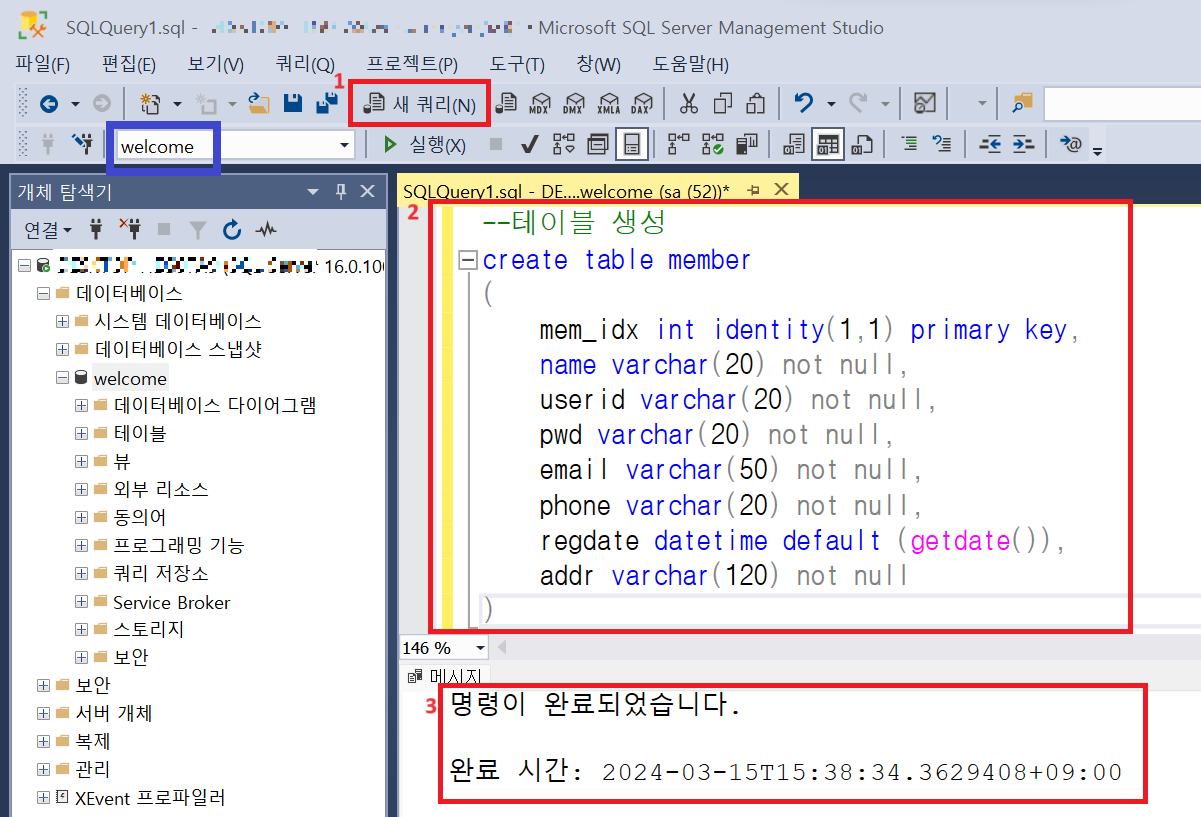이 때, 쿼리 위치가 master가 아니라 방금 생성한 DB 이름과 동일한지 확인해준다. - 사진에서 파란 직사각형 부분