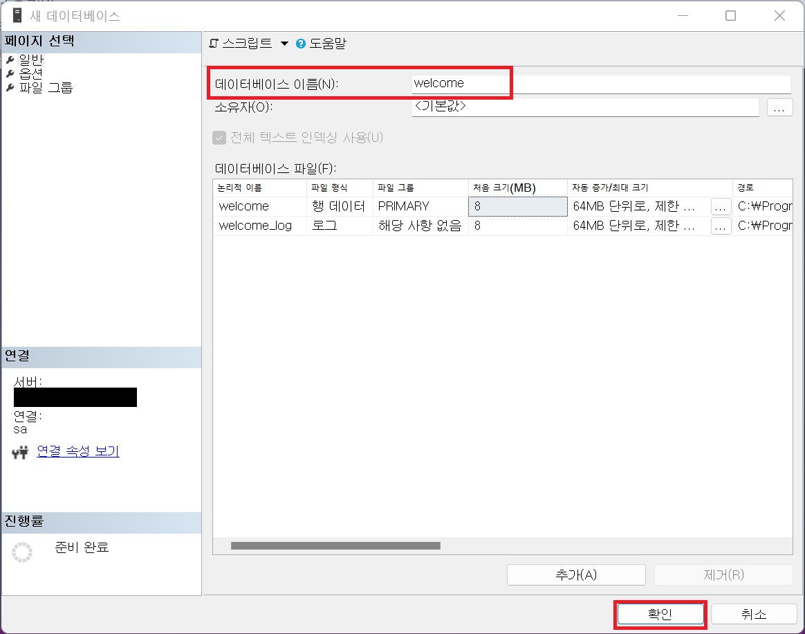 3. 데이터베이스 이름을 입력해주고 확인을 클릭한다.