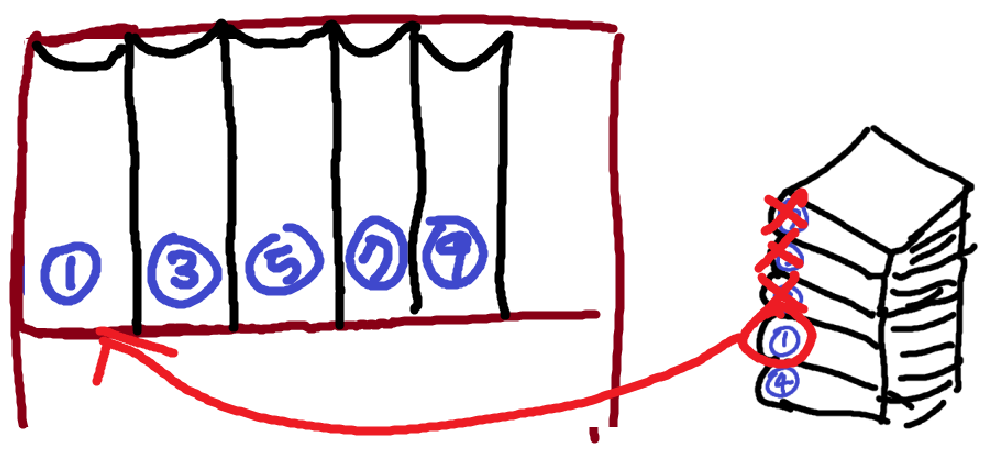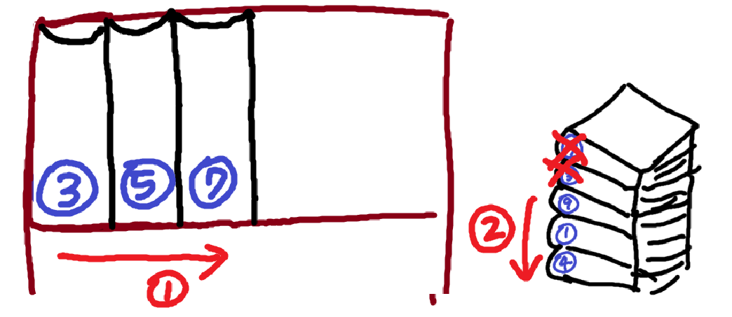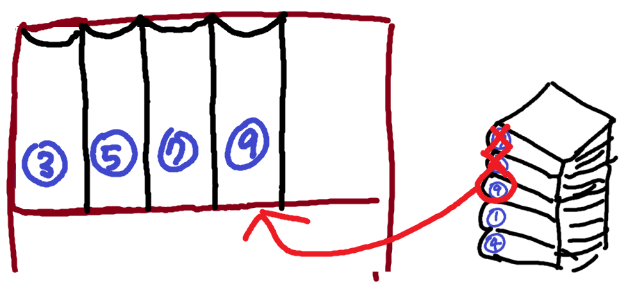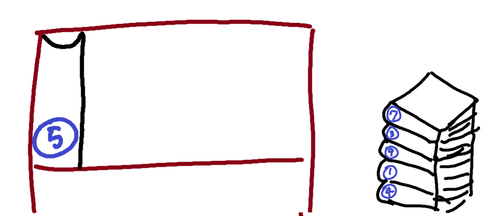맨 위의 7권은 5권 뒤에 와야한다. (이미 꽂혀있는 5와 비교, 비교횟수 : 1)