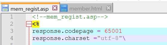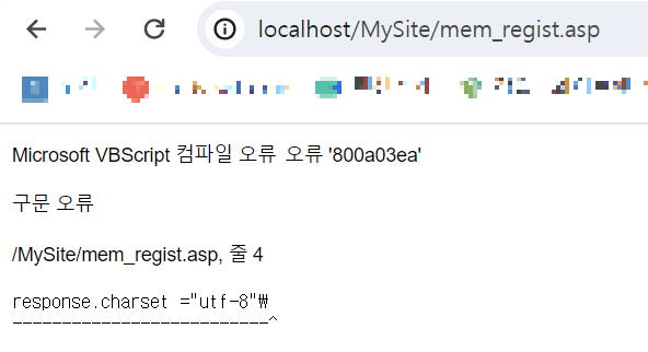 mem_regist.asp 파일 4번째 줄에서 구문 오류가 일어났다는 걸 보여주며,
