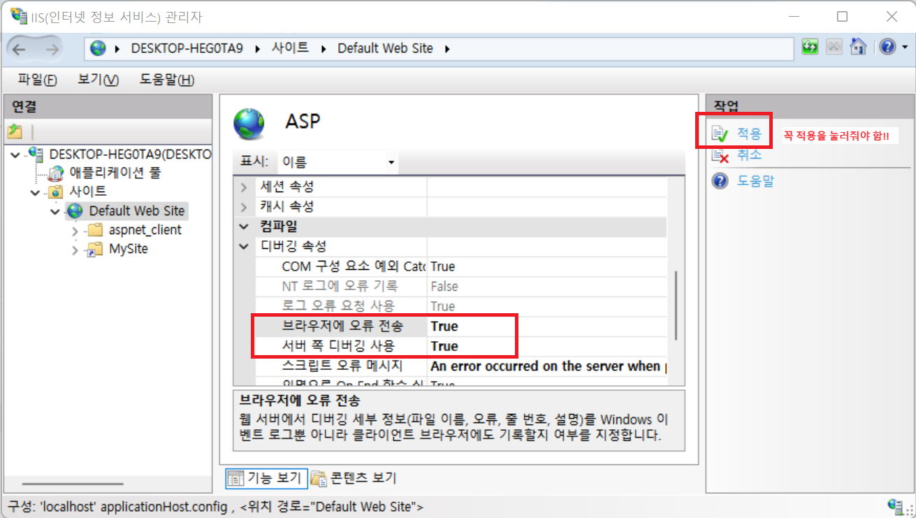 asp 사이트 구축 도중 오류 메시지 확인 방법