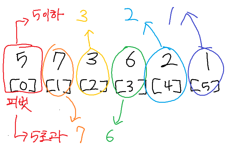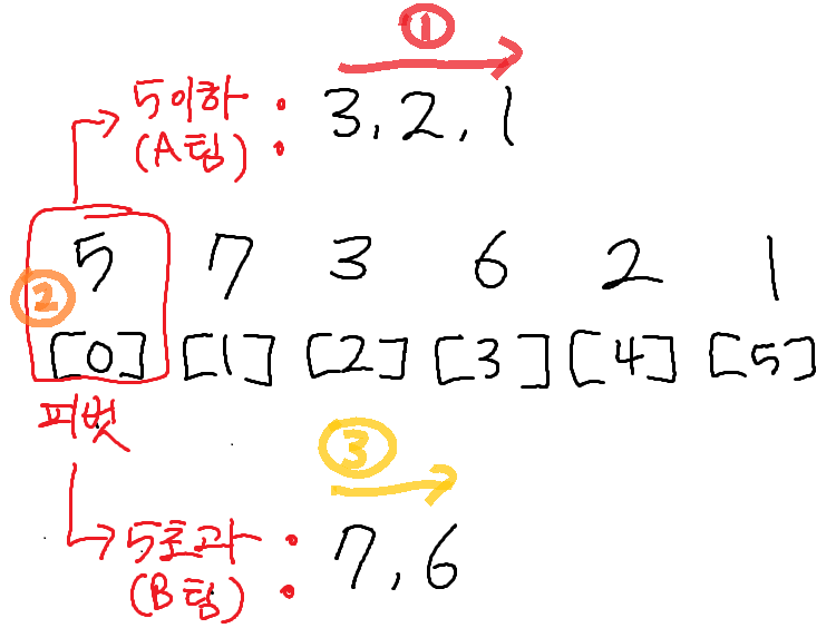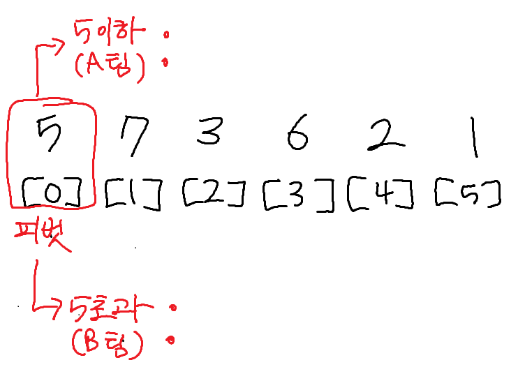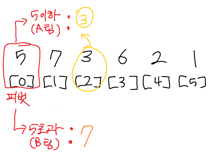 배열로 나타내면 피벗, A팀, B팀 순으로, [5, 3, 2, 1, 7, 6] 이 된다.