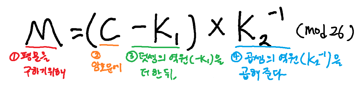 평문을 다시 꺼내기 위해서는 덧셈 암호를 먼저 풀고, 곱셈 암호를 풀어주어야 한다.