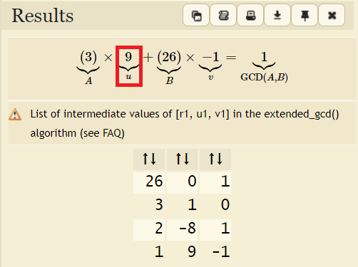 복호화 키가 3이라면, 3과 26으로 확장 유클리드 알고리즘을 거쳐준다.