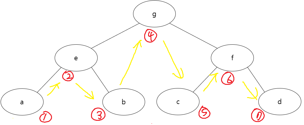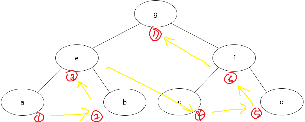 전체 후위 순회 결과는 a -> b -> e -> c -> d ->f -> g 가 됩니다.
