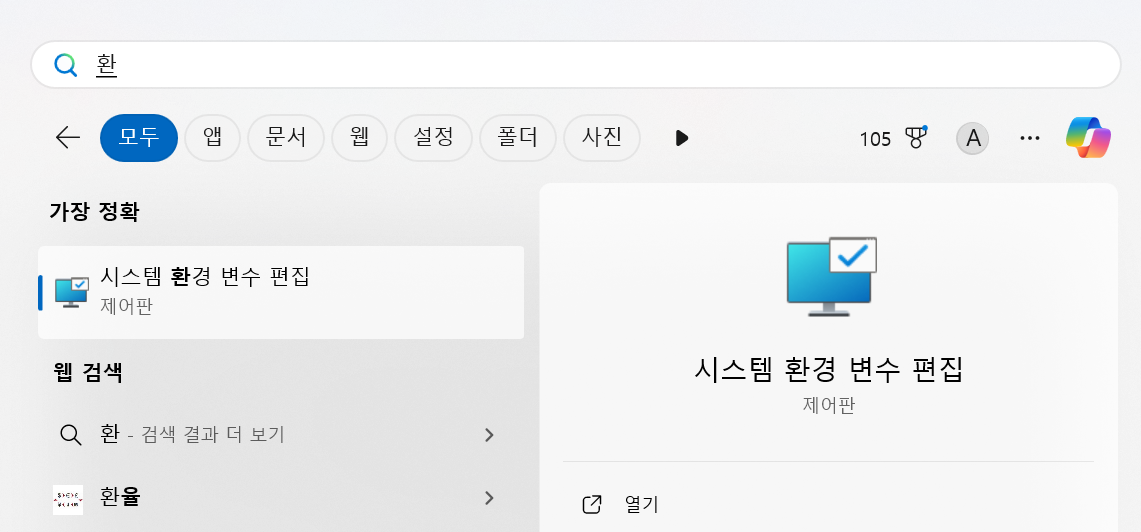 1. 윈도우 키 누르고 "환경" 검색 -> 시스템 환경 변수 편집