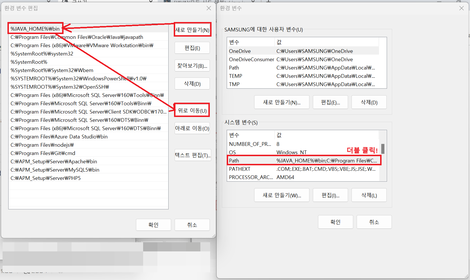 3. Path 더블클릭 -> %JAVA_HOME%\bin 입력 -> 맨 위로 갈 때 까지 위로 이동 눌러주기