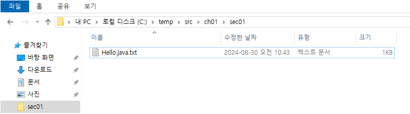 Hello.java.txt로 .java가 확장자가 아닌 파일명으로 저장되어있으므로 뒤의 .txt 를 지워줌