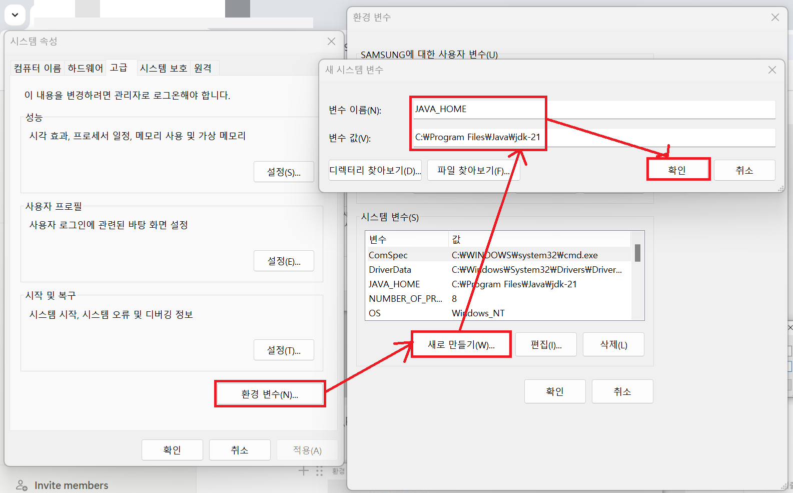 2. 시스템 속성 - 고급 - 환경변수 - 시스템 변수 새로 만들기