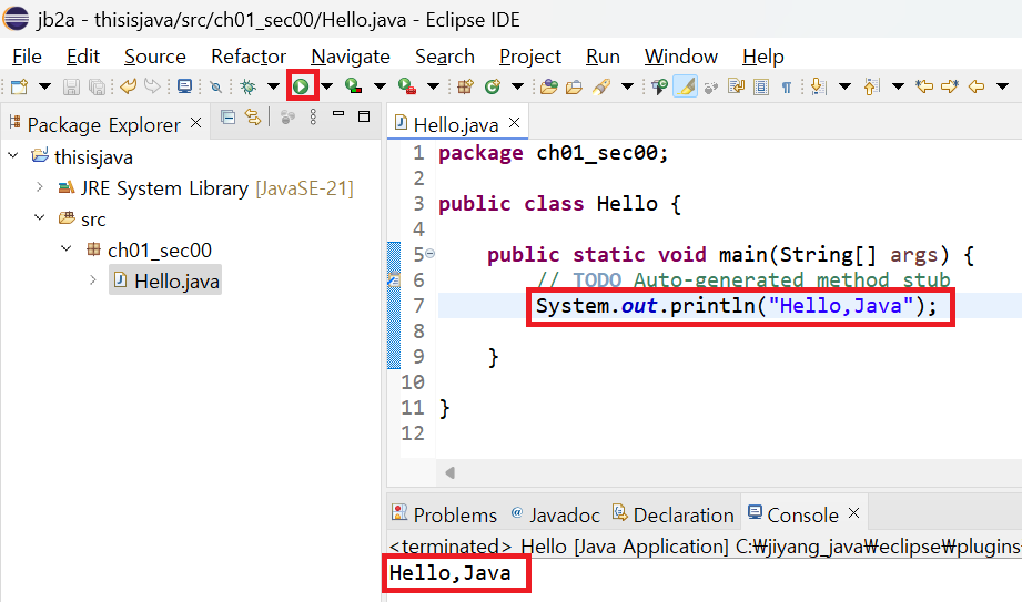 주석 아랫부분에 System.out.println("Hello,Java"); 구문을 추가해준 뒤 저장하고, 실행 버튼을 누르면