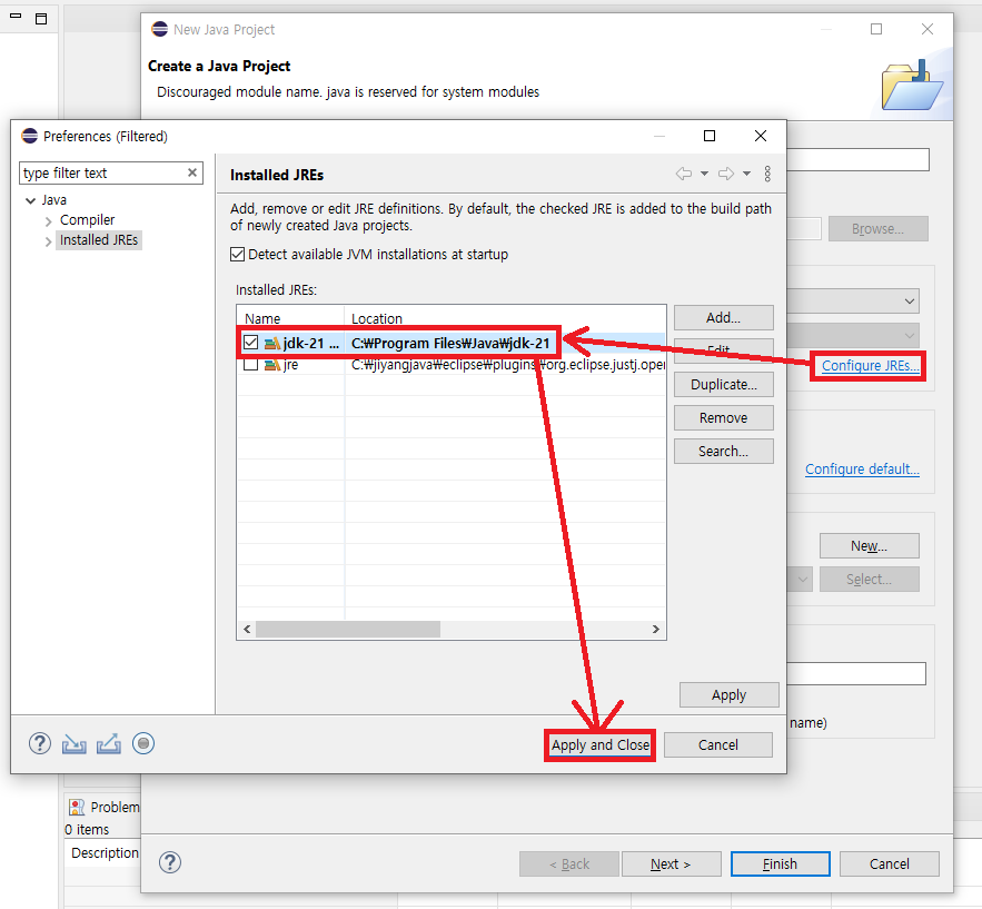 jdk-21 를 선택해주고 Apply and Close 클릭 (jdk-21이 없다면 환경변수 설정이 잘못된 거일수도 있다.)