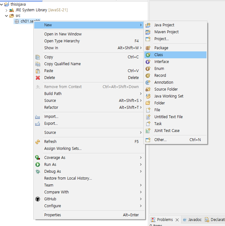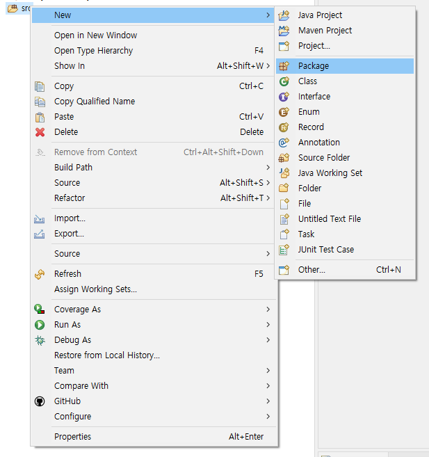 방금 생성한 패키지 위에서 우클릭 - New - Class