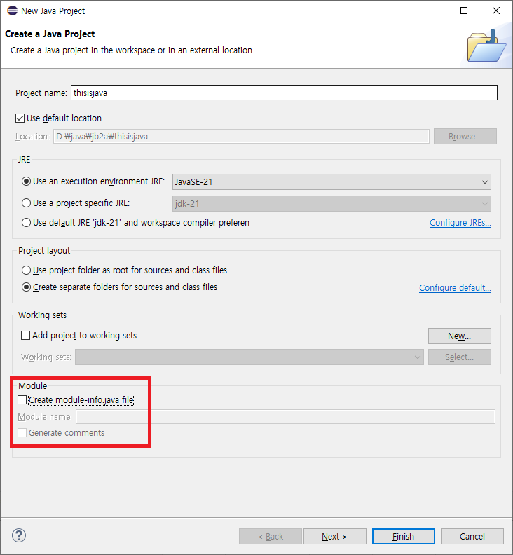 Module 체크를 모두 해제해준 뒤, Finish 를 클릭