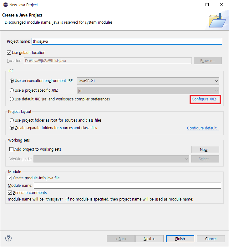 프로젝트 이름을 적어주고, Configure JREs 를 눌러준다.